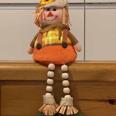 20*15cm Welcome the autumn season with this utterly charming plush scarecrow. With a sweet stitched smile, rosy cheeks, and a woven hat topped with a cheerful sunflower, this scarecrow is sure to bring a smile to your face