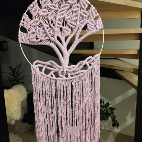 Luonnonvalkoisesta punoskuteesta solmittu työ. Mallin perusteella sopii hyvin joko portaikkoon tai eteistilaan. Työn korkeus 98cm. Leveys 58cm ja puu 70cm. Voin postittaa. Lemmikkikoti.