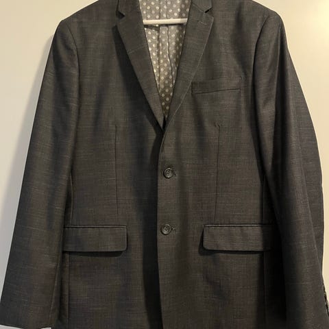 Tumman siniharmaa, pientä hillittyä ruutua. Red Label, Turo. Hihan pituus olkapään leikkauksesta 65 cm, helman leveys n 45 cm. Siisti, nuori mies pitänyt parissa juhlassa, kunnes jäänyt pieneksi. Halkiot.