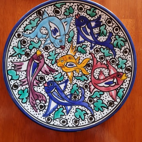 Seinälautanen, valmistettu keramiikasta. Lautanen on valkoinen ja siinä on musta piirroskuvio, joka esittää rakennuksia. Lautasessa on ripustuslenkit takana seinälle kiinnittämistä varten.