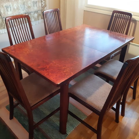 Laadukas täyspuinen ruskea ruokailuryhmä ja kuusi tuolia plyysikankaalla. Kuvan pituus 189 cm yhdellä jatkopalalla. Mukana kaksi muuta jatkopalaa, jolloin pituus yhteensä 269 cm. Levitettynä paikat 12 istujalle. Maksu Mobilepay tai käteinen. Vain nouto. Ei kuljetusta.