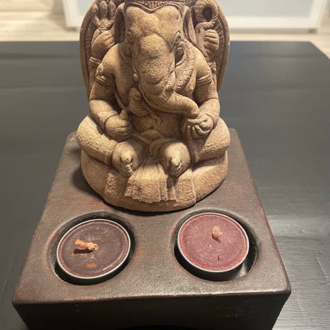 Figuri esittää hindulaisen jumalan Ganeshan, jolla on norsun pää ja joka istuu lootuskukalla.