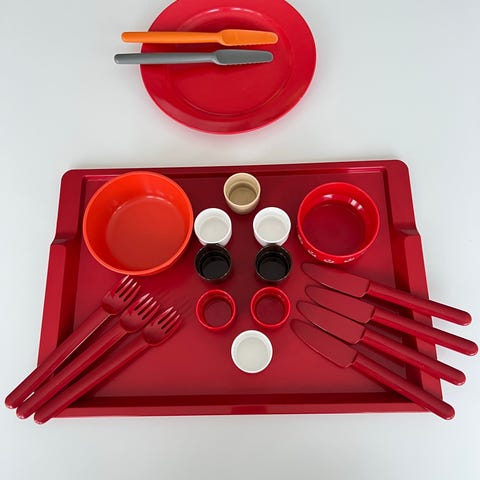 Fiskarsin saksien kahvojen oranssi lautanen Fiskamin nro 1510. Olof Bäckströmin suunnittelema melamiinilautanen. Fiskamin-sarja oli tuotannossa v. 1961-73. Lautasen koko n. 20 × 23 cm.