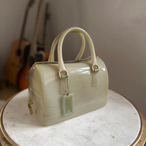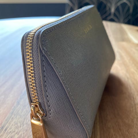 Furla laukku, pussukka, clutch harmaa/muta, 8x15x4cm, valkoinen säilytyspussukka, käytetty, ehjä ja siisti.