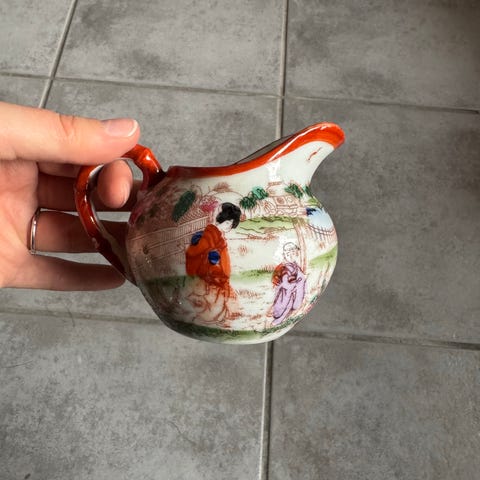 posliinikannu, jossa on hedelmäkuvio ja valkoinen pohjaväri. Kannun reunat ja kahva on koristeltu kullanvärisellä yksityiskohdalla. Materiaali posliinia.22 car kultaus lenigrad posliini. Tarjouksia otetaan vastaan.