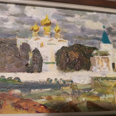 Öljymaalaus, jossa on kuvattuna munkki seisomassa ikkunan ääressä. Maalauksessa näkyy munkin valkoinen kaapu ja taustalla on ikkuna, josta näkyy maisema. Teos on kehystetty puukehykseen. Koko 47x60cm