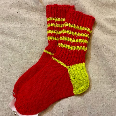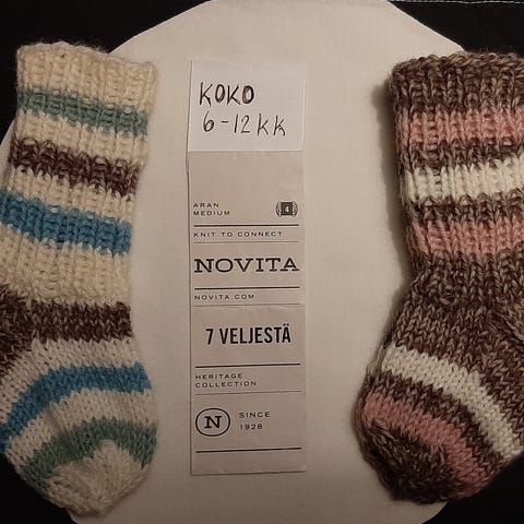 Käsin neulotut villasukat koko noin 39-40. Sukat on valmistettu Seitsemän veljestä villalangasta (80/20). Varsi yli 30 cm ja pohja 25 cm
