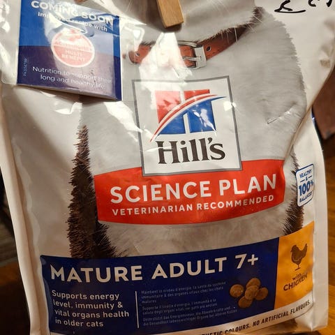 Kuivaruokapussi on avattu vaan, jotta nähtiin minkä kokoisia ne oli. Kissa ei ehtinyt syömään niitä. Märkäruokalaatikosta yksi pussi puuttuu. Joten niitä on 10 sijasta 9.