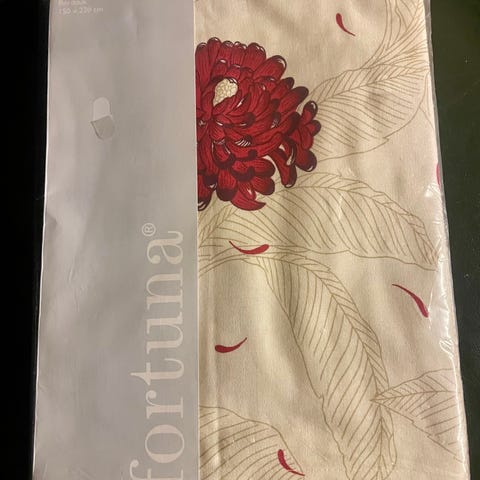Punainen pöytäliina ( 150 x 190 cm ) Puuvillaa. Liinassa on 2 pienen pientä reikää reunassa, jotka eivät näy käytössä. Liinassa on myös haaleita kahvitahroja, ne näkyvät nurjalla puolella, muttei Päälipuolella.