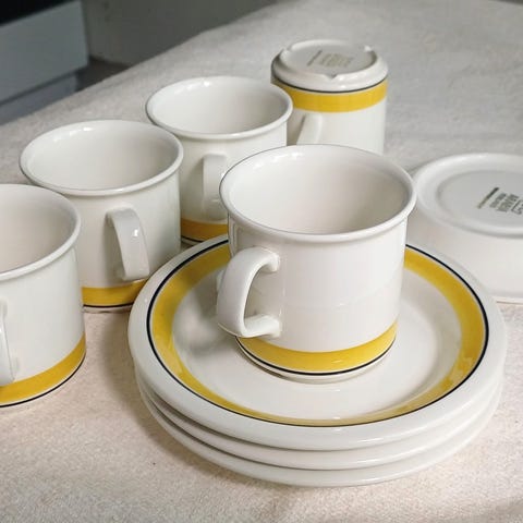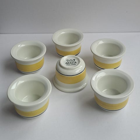 5kpl Arabia Faenza keltaraitaisia munakuppeha. Hyväkuntoiset. Design Peter Winquist 1974-1979.
