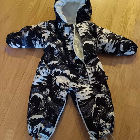 Toppahaalari tuplavetoketjulla. Käännettävät hihat ja lahkeet. Alaosan saa pussiksi tai haalariksi. Halutessaan saa mukana myös valkoiset tossut ja tumput.
