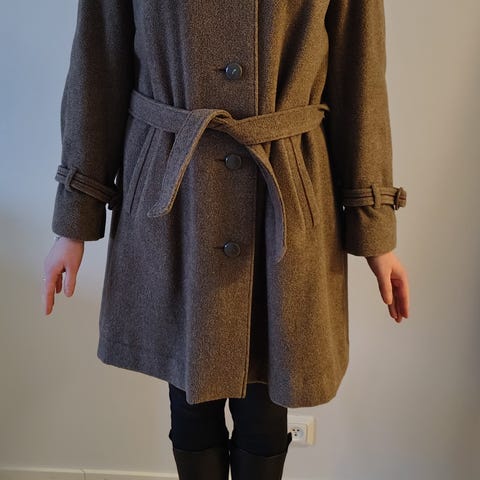 Takki on malliltaan alaspäin levenevä, a-linjainen, ja siinä on huppu. Päämateriaali on villakangas (55% villa 45% viskoosi) ja takissa on myös kevyt vuori. Erittäin hyvässä kunnossa, ei ole paljoa pidetty.