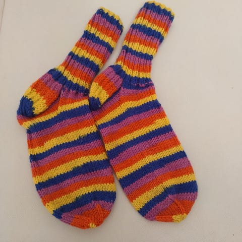 Punalilakirjavat villasukat. Uudet, itsetehdyt. Tästä vaikka joululahjaksi pukinkonttiin. Tehty 7 veljestä ja Muumi -langoista. Kestää konepesun. Terän pituus kantapäästä kärkeen n. 27-28cm, eli menee n. 41/42 jalkaan. Varren pituus ylälaidasta alas kantapäähän n. 22cm.
