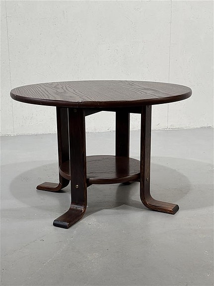Pyöreä retrohenkinen ruokapöytä, jossa on keltainen laminoitu taso ja puinen jalka. Pöydän muotoilu on yksinkertainen ja käytännöllinen, sopien monenlaisiin sisustustyyleihin. Pöydän jalka on keskitetty, mikä antaa sille tukevan rakenteen ja mahdollistaa tuolien sijoittamisen vapaasti ympärille.