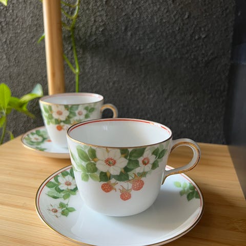 Koko L 9,5cm K 5cm, japanilaista Moriagi kohokuvioista läpikuultavaa posliinia, käsin maalattu, pohjassa näkyy valoa vasten katsottaessa Geishan kuva. Tekniikka on peräisin 1800-luvulta, nämä ovat 50 luvulta. eBayssa hinta yleensä 20$ pari, koko sarja 120 dollaria. Saatavilla 6 paria.