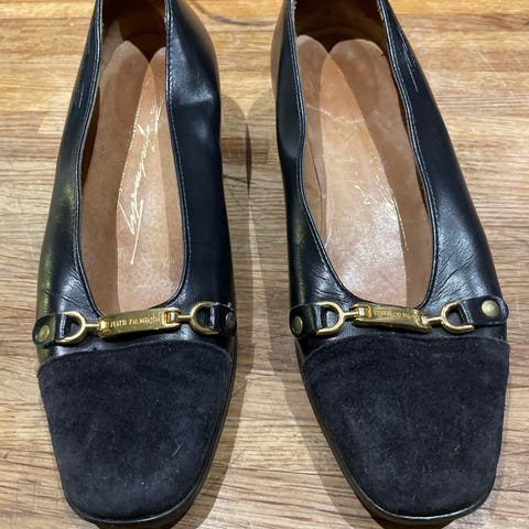 Pertti Palmrothin suunnittelemat mokka/kiiltonahkaiset juhlakengät kokoa 38,5. Korko on 5cm. Myös mokkanahkainen juhlalaukku on hänen suunnittelemansa ja sopii hyvin kenkien kanssa. Myydään yhdessä tai erikseen. Laukku erikseen 40 euroa.