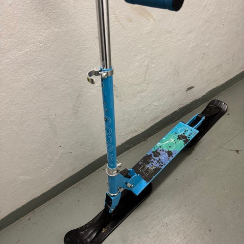 Punainen talvi potkulauta, jossa on mustat potkulaudan osat. Potkulauta on suunniteltu käytettäväksi talviolosuhteissa lumella tai jäällä. Varustettu kahvoilla ja säädettävällä ohjaustangolla.