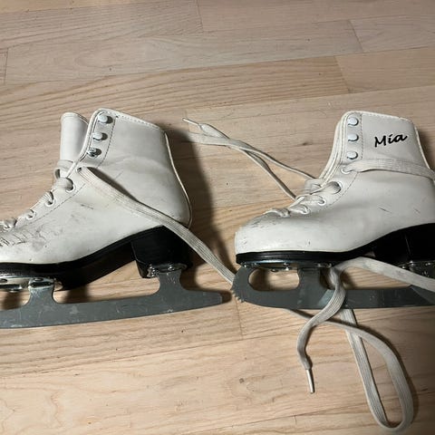 Mia lasten luistimet, koko 30. Luistimissa valkoinen väri ja perinteinen nauhakiinnitys. Sopivat luisteluun ja harrastamiseen. Terät ovat metalliset ja kengät valmistettu keinonahasta.