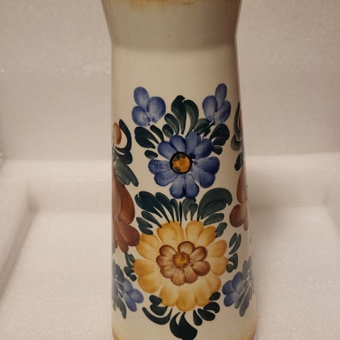 Pieni sininen kukallinen maljakko. Korkeus ja leveys 11cm, syvyys 4cm