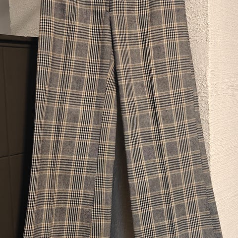 Siistit villasekoitehousut, joissa edessä laskokset ja taskut. Puntit kapenevat lievästi nilkkaa kohden. Sivussa vetoketju ja nappi. Vyötäröltä korkea ja tyköistuva, laskokset tekevät väljyyden vyötärön alapuolelle.