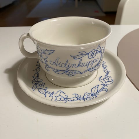 Arabia Äidinkuppi ja Isänkuppi tasseineen. Todella hyvässä kunnossa. Hintaan lisätään mahdolliset postikulut.