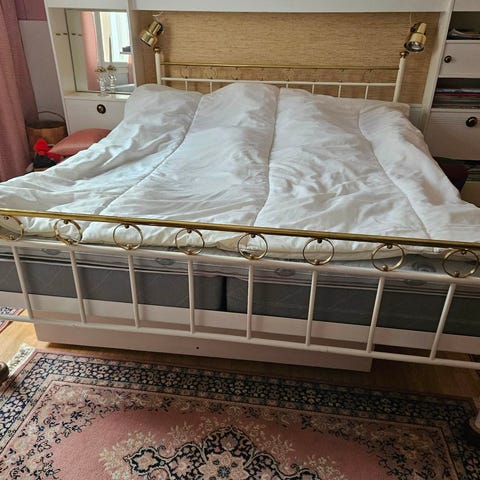 Metallisänky ja 2 yöpöytää, joissa valkoinen runko ja messinkiset yksityiskohdat. Sängyssä puupohja patjalle. Sängyn ulkomitat 211cm x 165cm. Tilaa patjalle 201cm x 161cm.