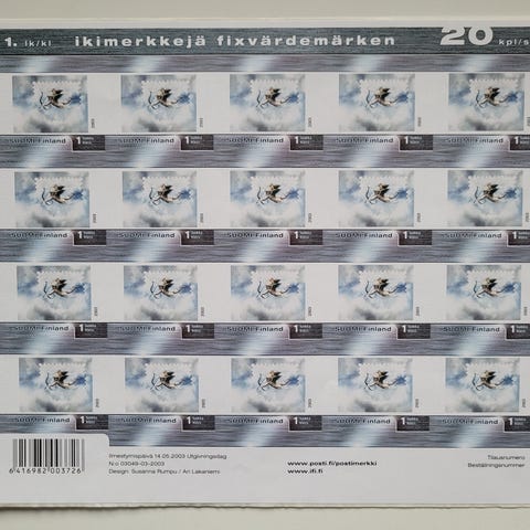 Postituoreita käyttämättömiä euroarvoisia postimerkkejä, postitusarvo 55€.