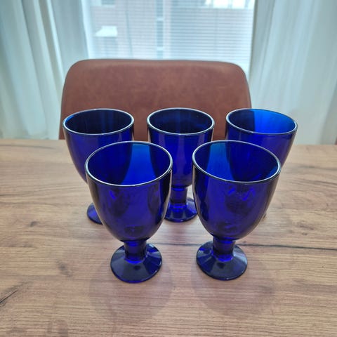 Siniset Iittalan viinilasit, 7kpl. Kolmessa on kiinni Iittalan tarrat, neljässä ei. Kaikkien pohjassa painatus: Kerttu Nurminen Iittala.