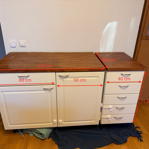 - lisäksi ulos vedettävä leipomisalusta allaskaapin vas. puolella, pystyssä (lev. 65 cm syv. 52 cm)