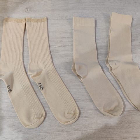 Eri värisiä uusia sukkia. Kaks mustaa, yksi sininen, yksi tummanharmaa ja yksi vaaleanharmaa pari.