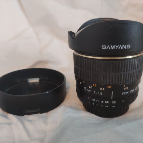 Samyang Fish-Eye CS 8 mm 1:3.5 kameraobjektiivi, musta väri.