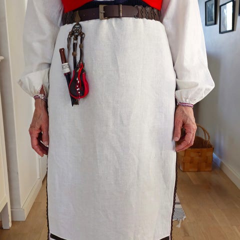 Mukaan kuuluu Hame, paita, esiliina, liivi, tasku ja tykkimyssy jossa kirjottu tyllipitsi.