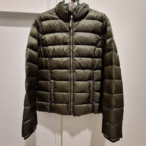 Tommy Hilfiger takki untuva täyte, koko L, väriltään sini-valkoraidallinen. Takissa on vetoketjukiinnitys ja kaksi taskua edessä. Kainalo - kainalo 52 cm, olka - helma 61 cm.