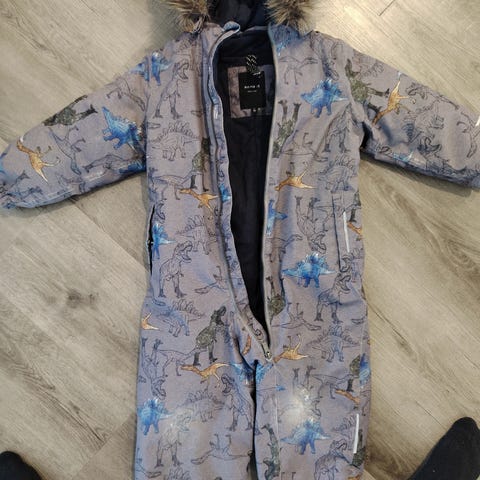 Paljon käytetty Name itin talvihaalari 110 cm. Reiluhkoa mitoitusta. Kulumaa polvissa ja takapuolessa (kuvat). Jalkalenksut puuttuvat.