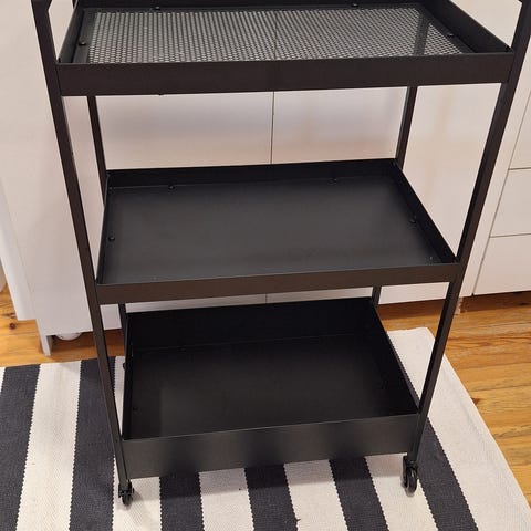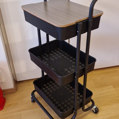Kaksitasoinen metallinen siirtovaunu, jossa on siniharmaa pinnoite ja siniset koriosat. Vaunu on varustettu pyörillä, mikä mahdollistaa helpon liikuteltavuuden. Soveltuu esimerkiksi pyykin tai muiden tavaroiden kuljettamiseen ja säilytykseen.