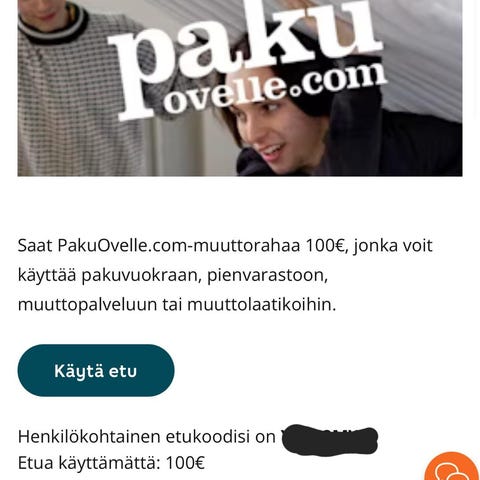 Cityseteli, jonka voi käyttää PakuOvelle.com, Cityvarasto tai Opiskelijamuutot.fi palveluissa. Arvo 30€. Viimeinen voimassaolopäivä on 14.07.2026. Tarpeettomaksi jäänyt.