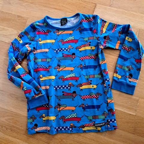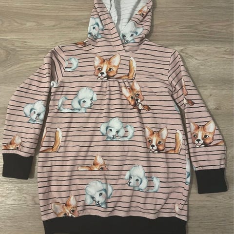 Itse tehty mäyräkoira/hot dog collari. Edessä taskut. Koko 134cm.
