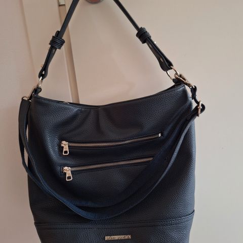 Hyväkuntoinen laukku. Sisällä pohjassa reilusti tummentumaa. Päällipuolella pieniä vaikeasti nähtäviä jälkiä. Päällä vetoketjun vieressä vaalentunut läikkä. Yleisilme erittäin hyvä. 38 x 25 x 11 cm.
