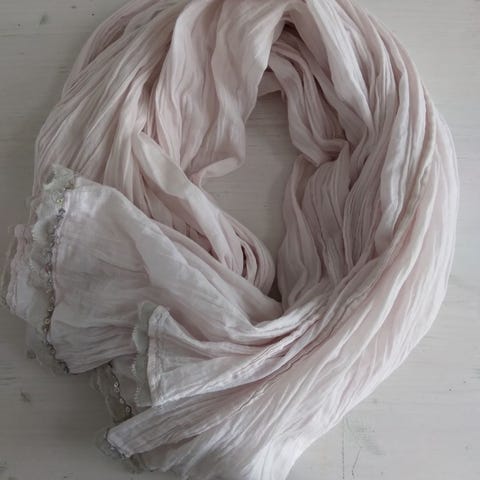 Puuvillainen huivi, jossa muutamia lankapakoja. Koko noin 95x95cm.