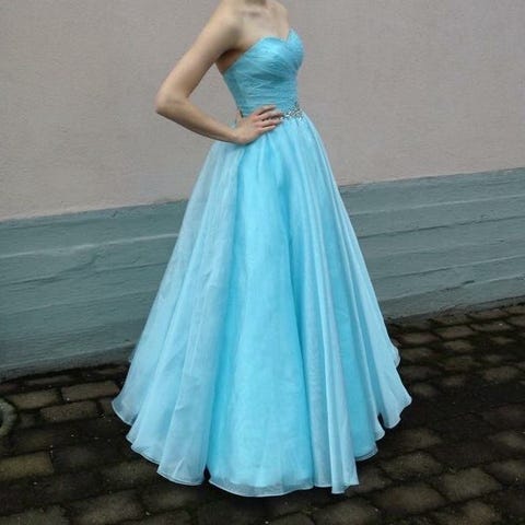 Myydään kerran käytetty jäänsininen vanhojentanssimekko. Lyhennetty n. 163cm pitkälle (+ n. 6cm korot) Kokoa helppo säätää takana olevien nyöritysten ansiosta. Mukaan vannehame, jolla myös helman muhkeutta voi halutessaan säädellä.