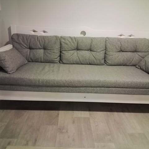 Todella nätti kahden istuttava antiikkimäntysohva pehmusteineen ja tyynyineen. Istuimen alla hyvä tavaroidensäilytystila noin 20cm syvä.