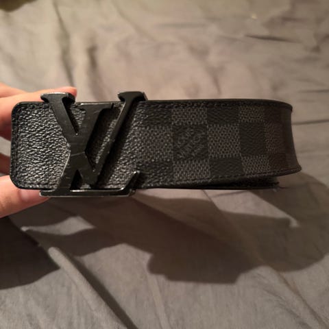 Louis Vuitton vyö, valmistettu nahasta. Sopii miehille. Vyössä on kullanvärinen solki. Vyön sisäpuolella näkyy Louis Vuittonin merkintä ja valmistusmaa Espanja. Vyön pinnassa käytön jälkiä ja kulumaa.