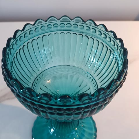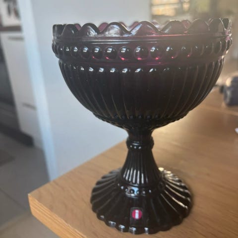 Iittala Mariskooli on valmistettu sinisestä lasista. Kulho on jalallinen ja siinä on koristeellinen reuna. Sopii jälkiruokien ja muiden tarjoilujen esillepanoon.