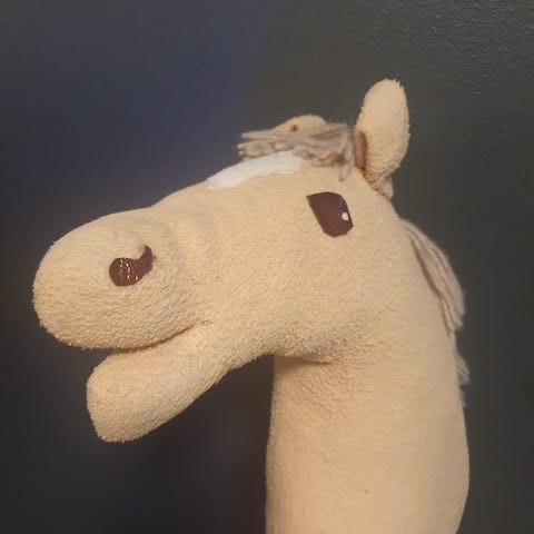 Hyväkuntoinen keppihevonen ruskeavalkoinen