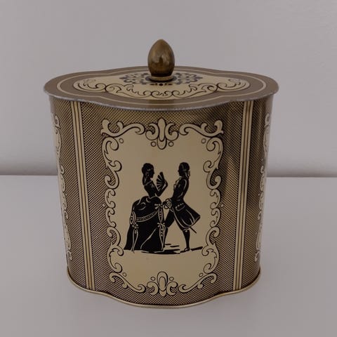 Kaunis puna-kultainen Hellas-makeisrasia 1970-luvulta. Kuvituksena antiikin Kreikka. Avain puuttuu ja on käytön jälkiä.