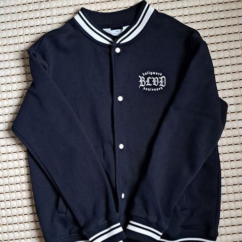 Viininpuna-valkoinen H&M Baseball-takki. Hyväkuntoinen, ei näkyviä jälkiä tai tahroja. Nukkaa kertynyt, kävin takin läpi nukkaimurilla, jonkin verran näkyvissä vielä. Valkoinen väri hihoista osin haalistuneen näköinen. Koko 158/164cm.