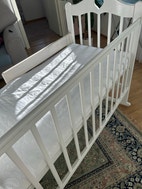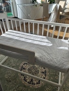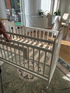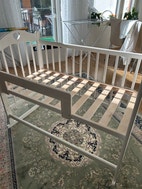 Myydään vauvansänky patjalla, todella siisti! Etupuoli on irrotettu (mutta se on ehjä ja hyvässä kunnossa ja se voidaan asentaa takaisin helposti) ja suojalevy on asennettu estämään lasta putoamasta nukkuessaan.