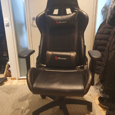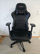 Isollekin kaverille sopiva musta pelituoli, käyttäjän painoraja oli tähän tuoliin muistaakseni 160kg. Edelleen hyvässä kunnossa, ainoana miinuksena tuolin yläosassa (näkyy kuvassa) pieni n. 1 cm vekki verhoilussa.