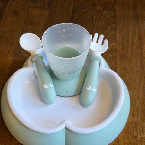 babybjörn ruokailusetti, kaksi lautasta ja kaksi haarukka ja kaksi lusikka. On ollut käytössä yhdellä lapsella. Aitoa, ostettu Suomesta.