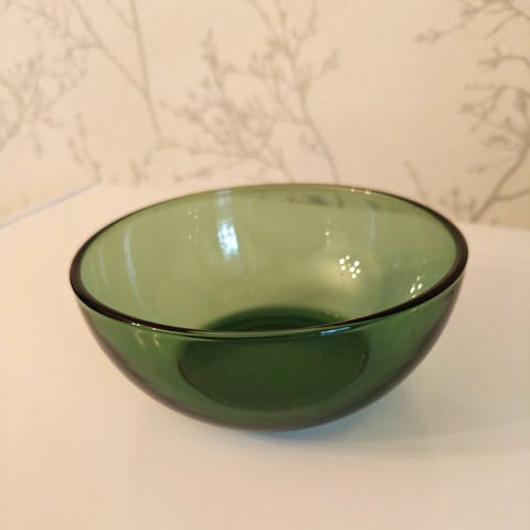 Iittala vihreä lasinen kulho. Valmistettu kestävästä lasista, halkaisija noin 20 cm. Käyttötarkoituksena esimerkiksi salaattien tai muiden ruokien tarjoilu.